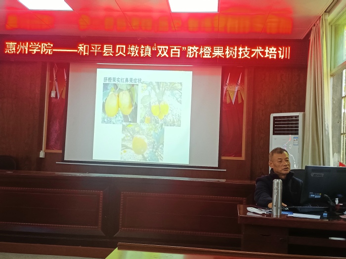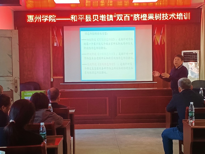 为精准破解脐橙种植技术瓶颈,推动脐橙产业绿色高质量发展,11月14日,我校联合和平县科创中心、和平县贝墩镇人民政府及贝墩镇武联村委会共同主办的“2025年贝墩镇脐橙种植技术创新与绿色防控培训会”在武联村委会会议室举行。知名脐橙黄龙病防治专家、江西于都县农业技术推广中心华斌研究员,以及我校钟平生教授担任主讲嘉宾,贝墩镇20余名脐橙种植户、农业技术人员现场参会。