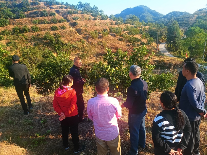 理论培训结束后,两位专家走进武联村脐橙种植基地,开展“田间课堂”现场教学。华斌手持染病枝叶样本,生动演示了黄龙病引起的叶片黄化、果实畸形和根系坏死等典型症状,指导果农准确识别病害。他强调,防控黄龙病关键在于切断传播途径,应严格执行植物检疫,从无病苗圃引种,并确保新建果园与染病区保持安全距离,从源头控制病害传播。